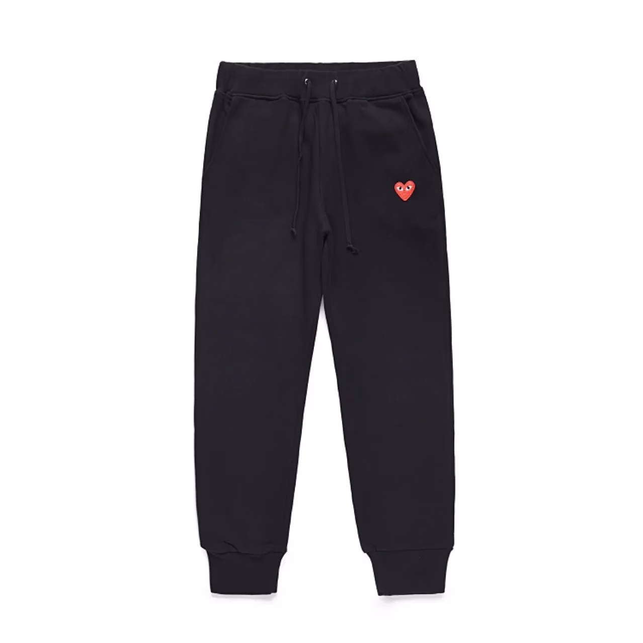 The Comme des Garcons Play Red Heart Logo Black Sweatpants is a shot of the uninhibited minimalism and a hint of mischievousness. These sweatpants are creatively made in deep black cotton fleece with the well-known red heart logo that immediately raises the design level with the simple loungewear category to a statement piece within the streetwear culture. So easy to dress down or up, they are comfortable and give you a confidence boost in your everyday fit.